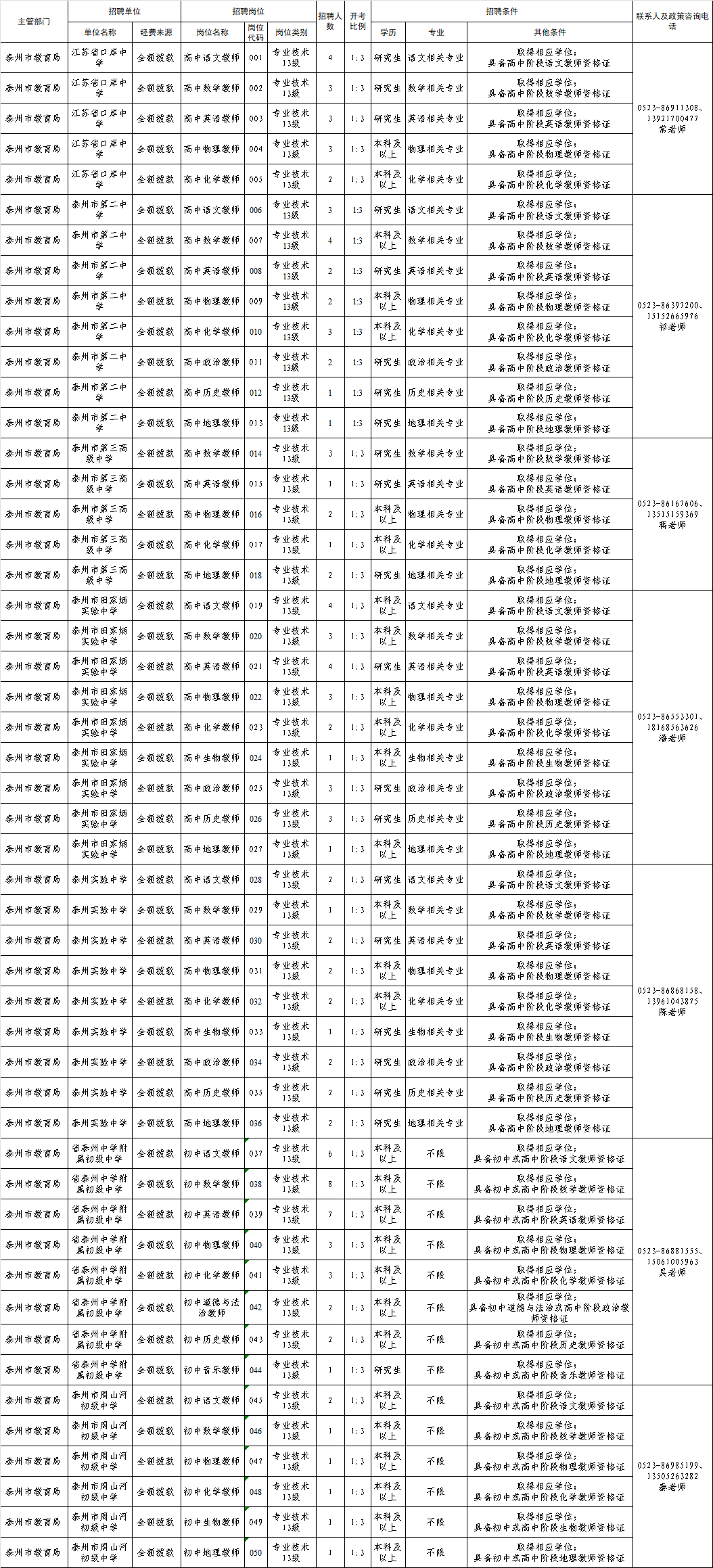 为进一步加强教师队伍建设,根据《江苏省事业单位公开招聘人员办法》《关于进一步做好全省中小学校新进教师公开招聘工作的意见》《关于进一步做好全市中小学教师公开招聘工作的通知》精神,泰州市教育局直属学校将赴相关高校招聘全额拨款事业编制教师121名。现将有关事项公告如下: