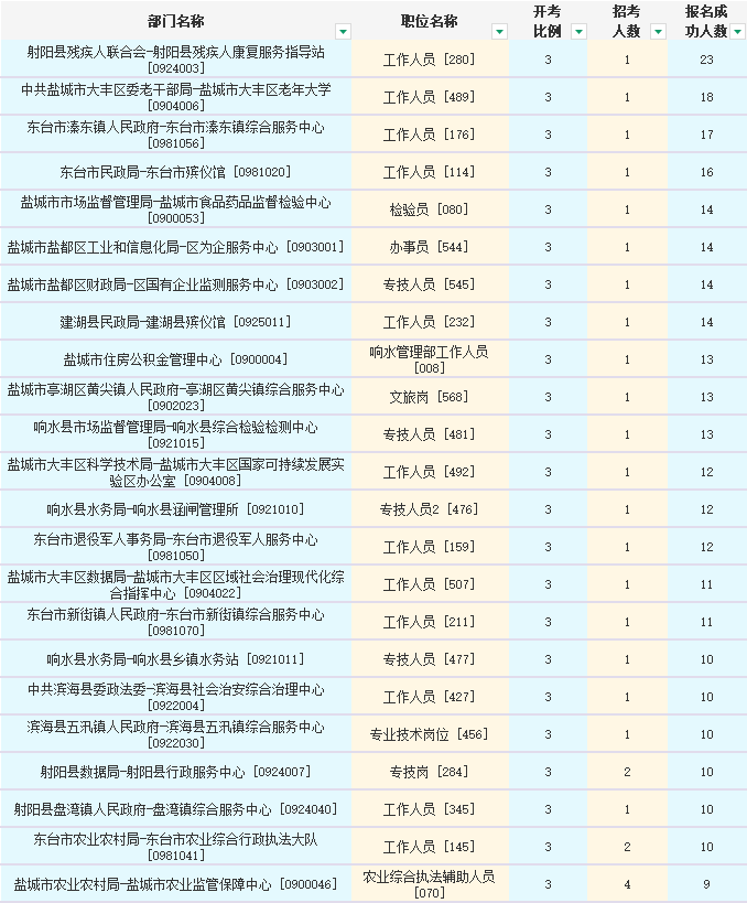 射阳县残疾人联合会-射阳县残疾人康复服务指导站 [0924003]-23人报名成功; 盐城市大丰区委老干部局-盐城市大丰区老年大学 [0904006]-18人报名成功; 东台市溱东镇人民政府-东台市溱东镇综合服务中心 [0981056]-17人报名成功。以下为报名人数前十的岗位: