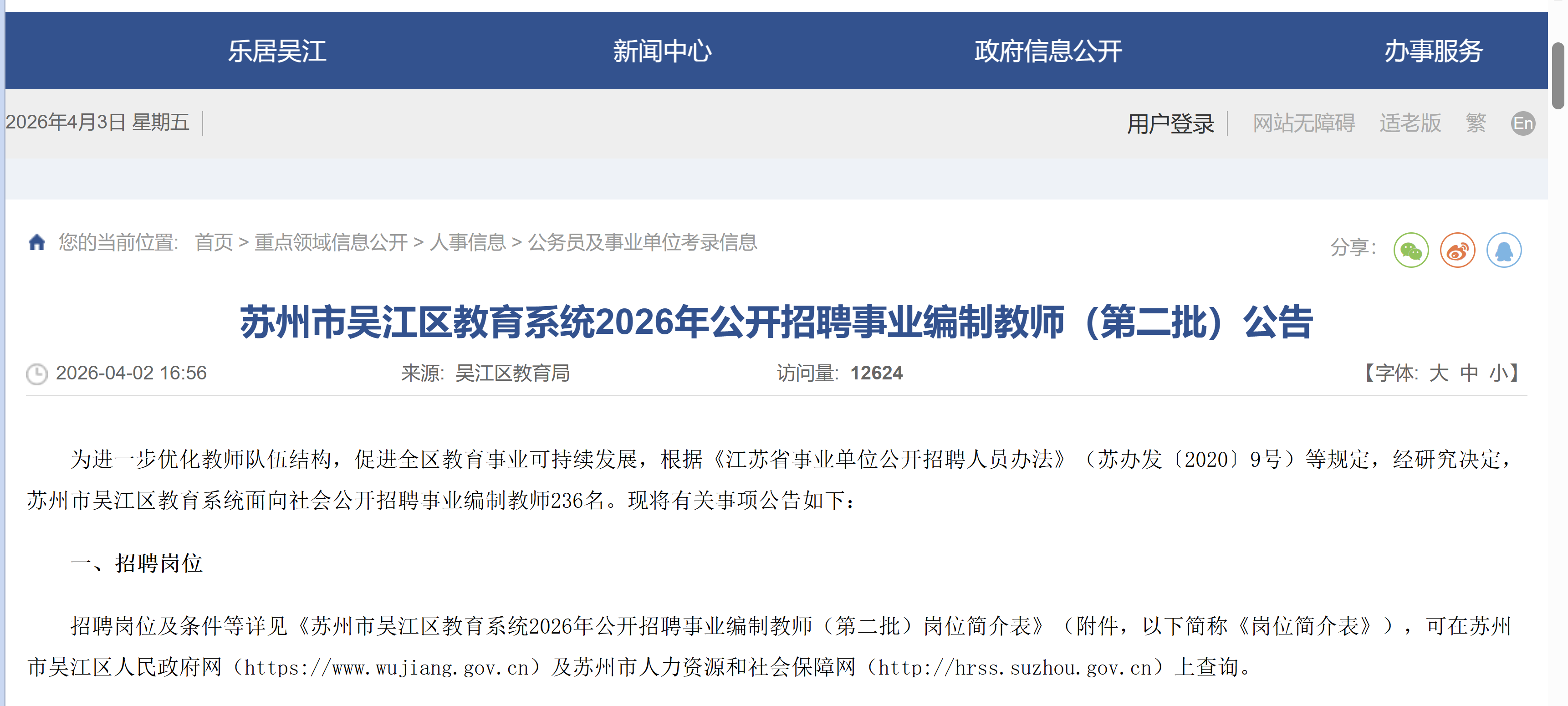 苏州市吴江区教育系统2026年公开招聘事业编制教师(第二批)公告
