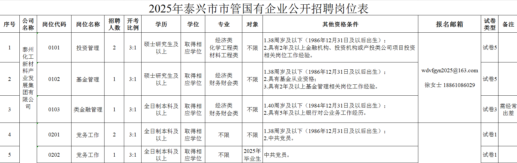 3.报名材料:(1)《2025年泰兴市市管国有企业公开招聘报名登记表》(以下简称《报名登记表》,附件3);(2)本人有效居民身份证;(3)毕业证书、学位证书、职称证书;(4)学信网打印的《教育部学籍在线验证报告》、教育部留学服务中心出具的学历和学位认证;(5)本人相关工作经验的证明材料和个人承诺书。报名时需将上述相关报名材料以一个PDF文件(用岗位代码+岗位名称+报考人员姓名命名)形式上传,发送至指定邮箱(邮箱网址详见《岗位表》)。同时上传本人近期免冠照片一张。应聘人员应准确、规范填写《报名登记表》,如因所填写内容不真实、不准确、不全面而影响本人考试或聘用的,责任自负。