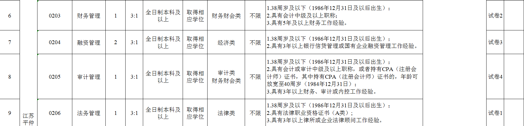 1.笔试内容:试卷1公共基础知识;试卷2会计专业知识;试卷3融资专业知识;试卷4审计专业知识;试卷5投资管理专业知识。具体考试试卷类型见《岗位表》。笔试满分为100分,合格分数线为60分。
