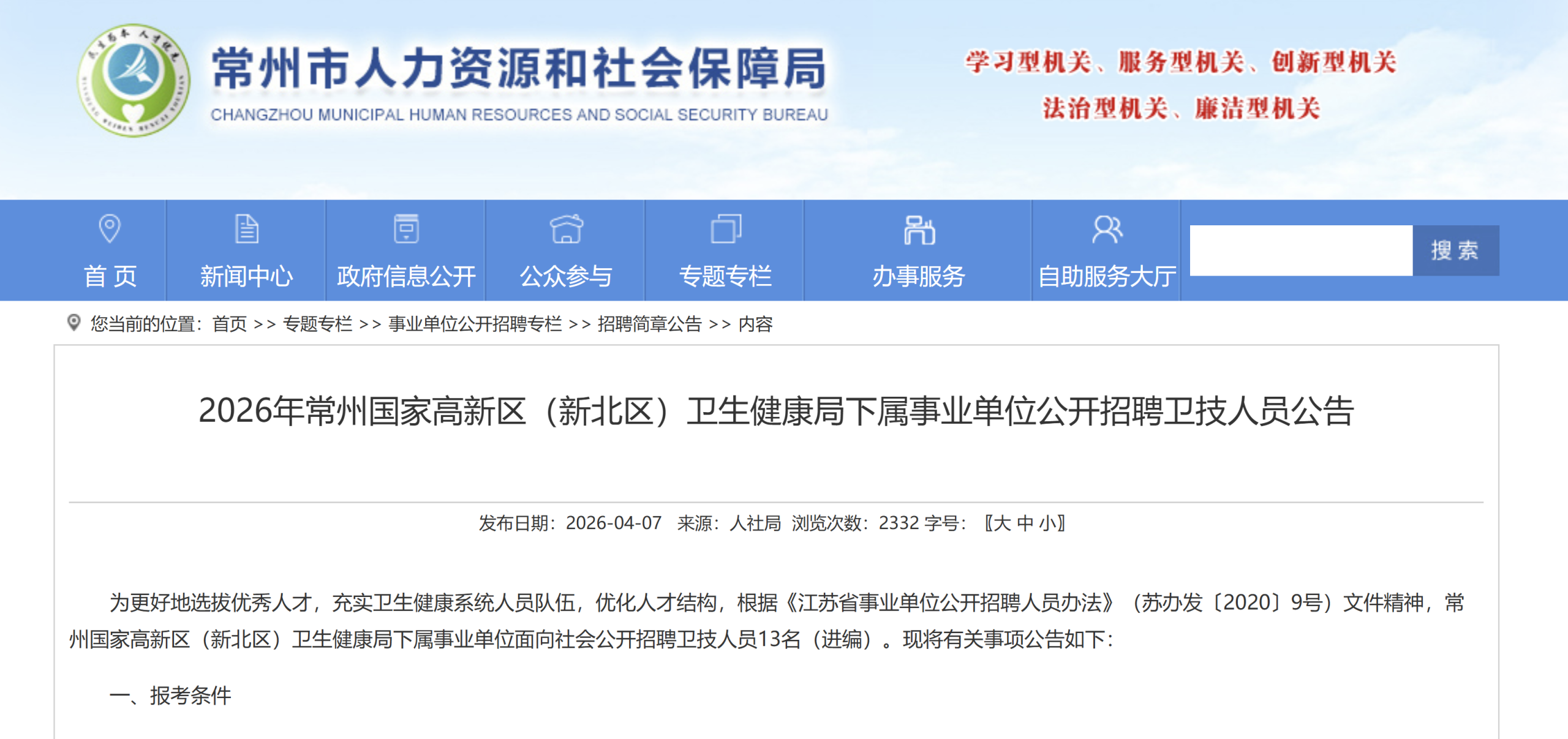 - 13人!不限户籍!事业编!常州国家高新区(新北区)卫生健康局下属事业单位公开招聘卫技人员公告