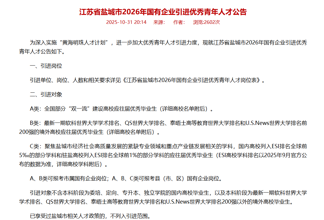 • 601人!江苏省盐城市2026年国企、事业单位公开招聘 青年人才公告!
