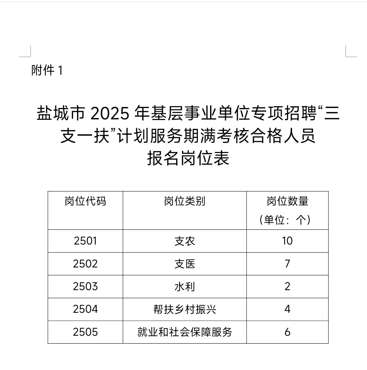 • 29人!盐城市2025年基层事业单位专项招聘“三支一扶”计划服务期满考核合格人员公告