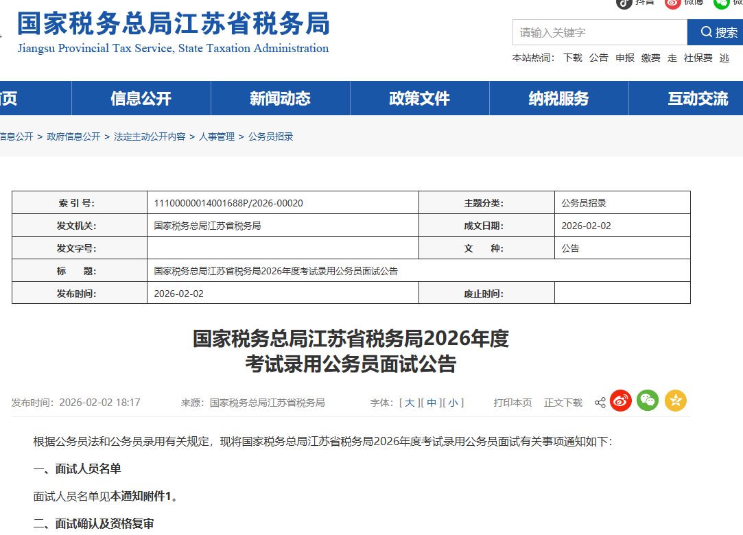 根据公务员法和公务员录用有关规定,现将 税务总局江苏省税务局2026年度考试录用公务员面试有关事项通知如下: