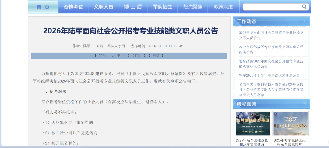 • 1537人!军队文职!2026年陆军面向社会公开招考专业技能类文职人员公告