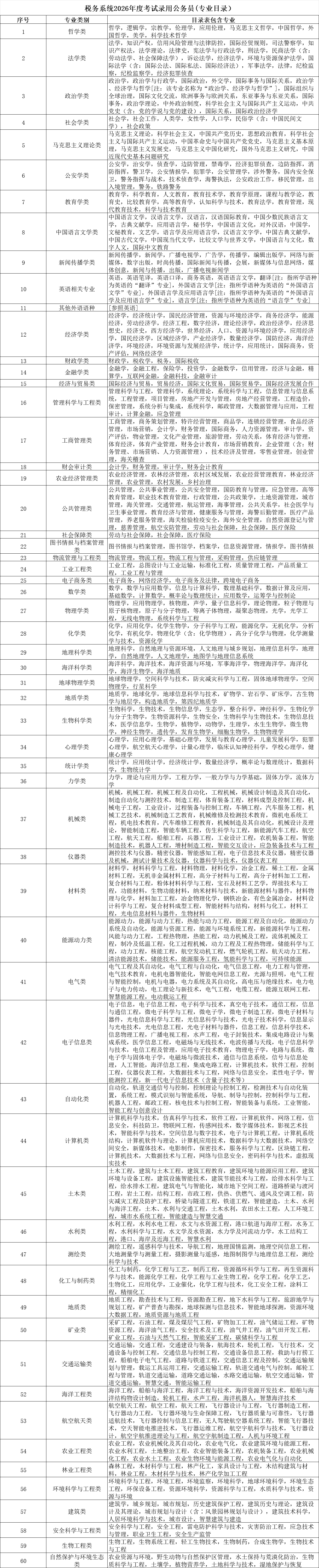 五、关于招考专业。根据2026年度税务系统考录公务员职位需求编制的专业参考目录(见下表),包含了本科及以上学历层次所需的相关专业。报考人员所学专业不在本表范围内的一般不接受报考,尝试使用个别相近专业报考的,须如实准确填写本人所学专业名称及专业代码,在“学科成绩”或“备注”栏内完整填写该专业所有课程名称和成绩,并对所学专业进行简要描述和说明,由招录机关根据报考人员实际情况及用人单位人才需求,综合进行资格审查。