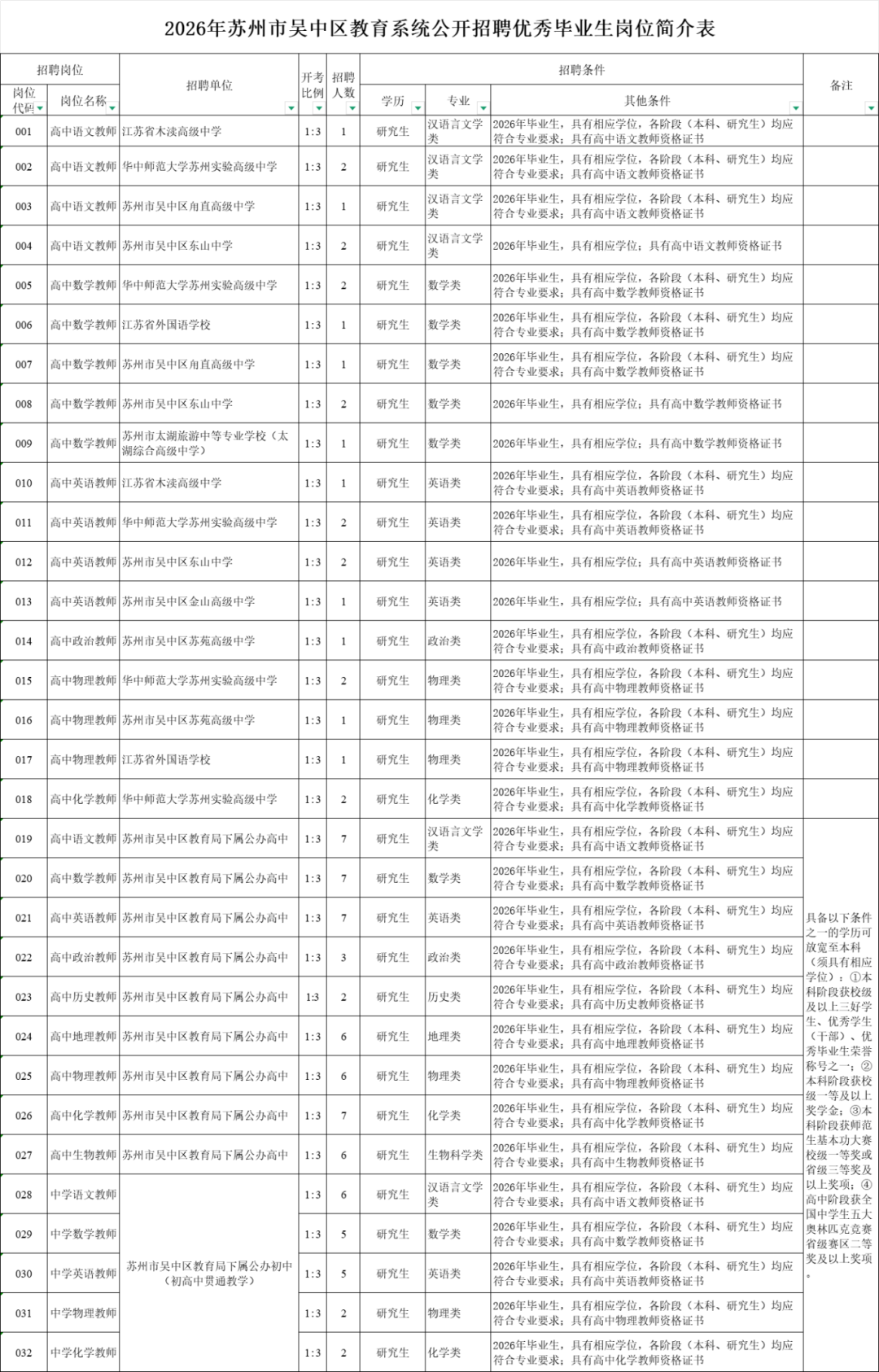(三)招聘对象为2026年硕士研究生及以上学历应届毕业生(本科及研究生阶段均须具有相应学位)。符合下列条件之一的2026年毕业生,报考019-032岗位,学历可放宽至本科(须具有相应学位):①本科阶段获校级及以上三好学生、 学生(干部)、 毕业生荣誉称号之一;②本科阶段获校级一等及以上奖学金;③本科阶段获师范生基本功大赛校级一等奖或省级三等奖及以上奖项;④高中阶段获全国中学生五大奥林匹克竞赛省级赛区二等奖及以上奖项。(以上相关证书,须在报名截止前取得。)