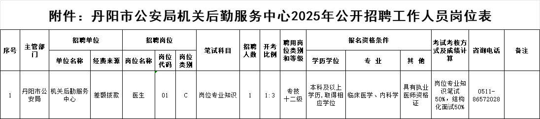 (七)招聘岗位、人数和所要求的学历、专业等资格条件详见《丹阳市公安局机关后勤服务中心2025年公开招聘工作人员岗位表》(附件1,下简称《岗位表》)。其中专业参考目录为《江苏省2025年度考试录用公务员专业参考目录》、《2025年硕士专业目录》。