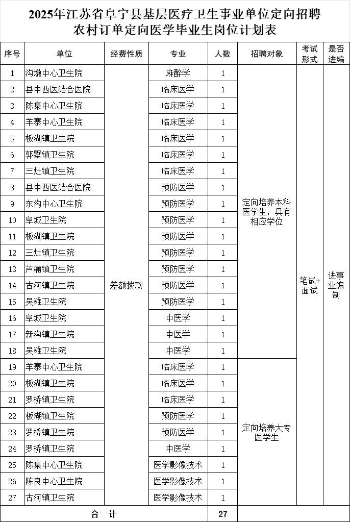 - 27人!医疗编!2025年江苏省阜宁县基层医疗卫生事业单位定向招聘农村订单定向医学毕业生通告