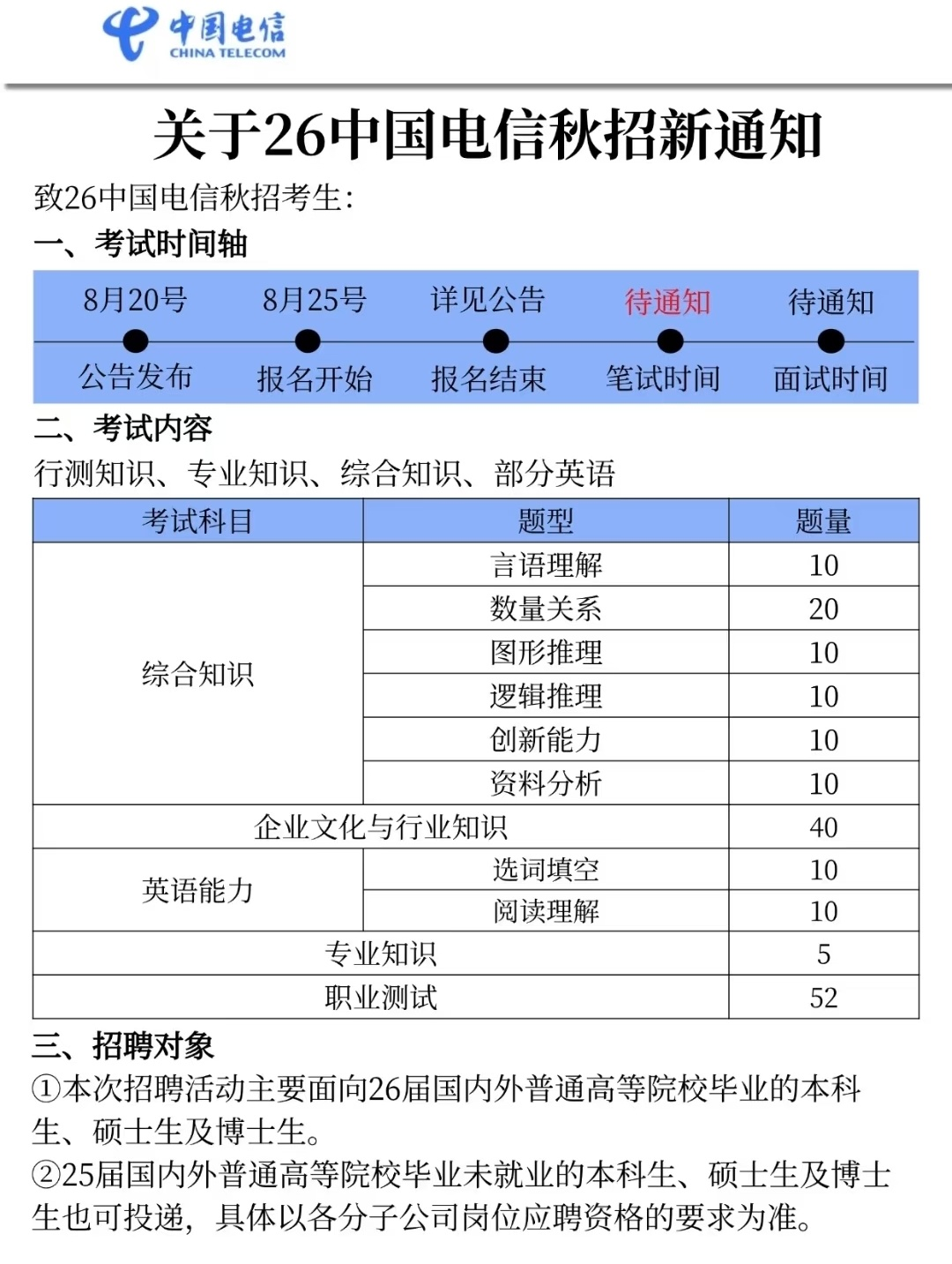 除中国电信集团有限公司集中组织的秋季招聘线上 笔试外(部分单位参与,以后续通知为准),本次招聘由中国电信集团所属分子公司根据招聘计划,自行组织笔试面试。各单位将根据简历筛选情况,安排学生参加笔试、面试。将通过电子邮件或短信方式进行通知。也可以通过中国电信招聘网站查询各分子公司的笔面试通告。