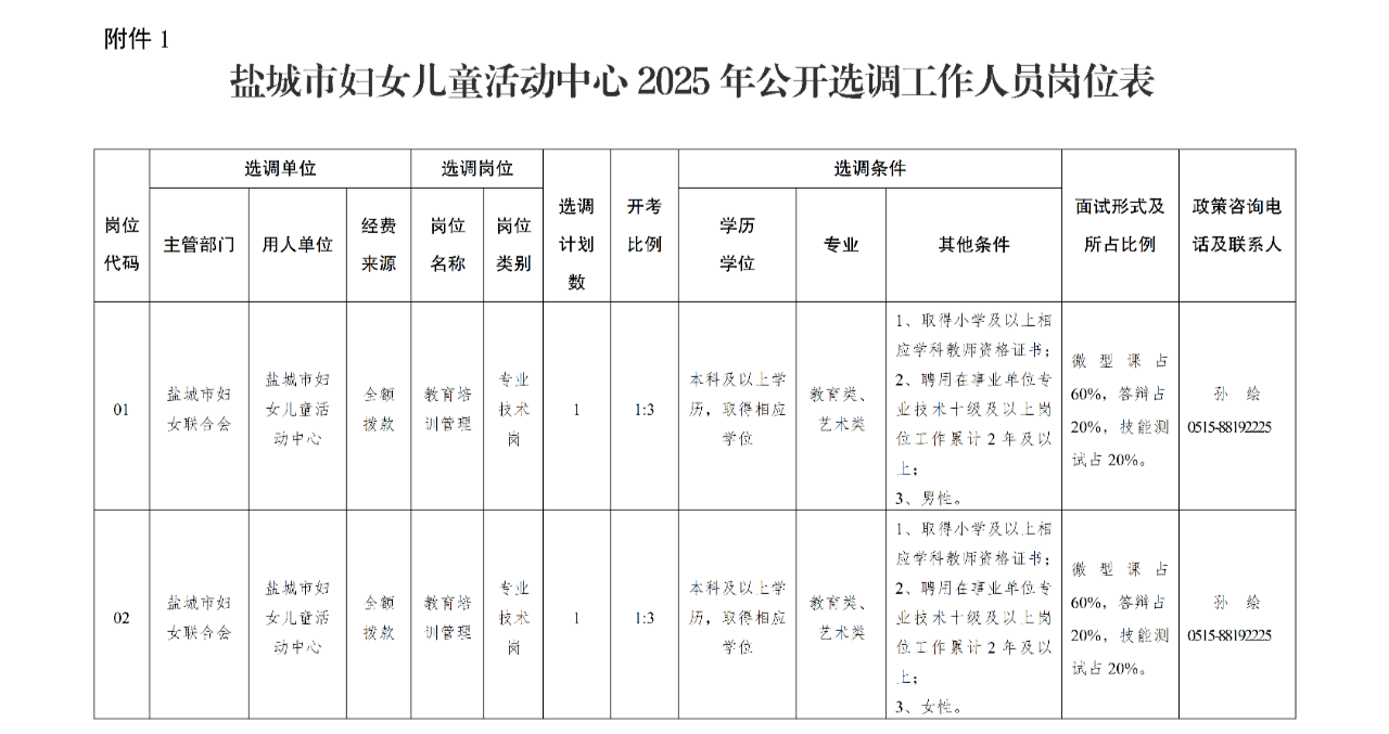 - 2人!盐城市妇女儿童活动中心关于公开选调工作人员的公告