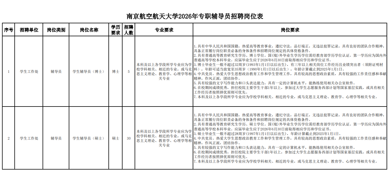 (一)招聘岗位招聘岗位及具体要求详见《南京航空航天大学2026年专职辅导员招聘岗位表》
