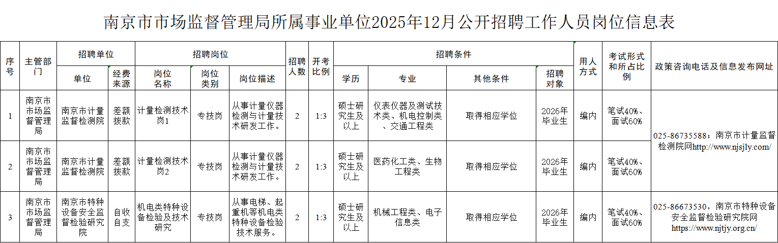 - 6人!事业编!南京市市场监督管理局所属事业单位2025年公开招聘工作人员公告!