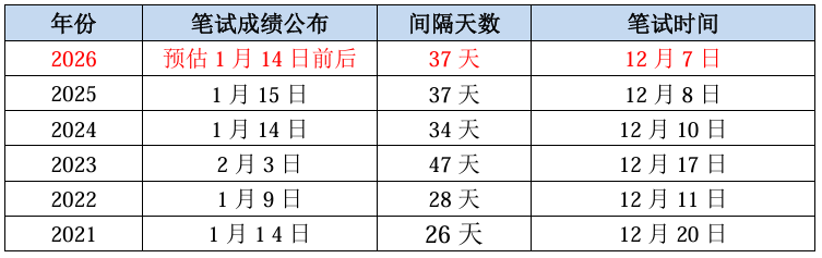 近几年国考笔试成绩公布时间几乎与江苏省考同步。2025年国考笔试成绩公布的时间是1月14日晚。由此推测,2026年国考笔试成绩公布时间可能是在1月13日晚。