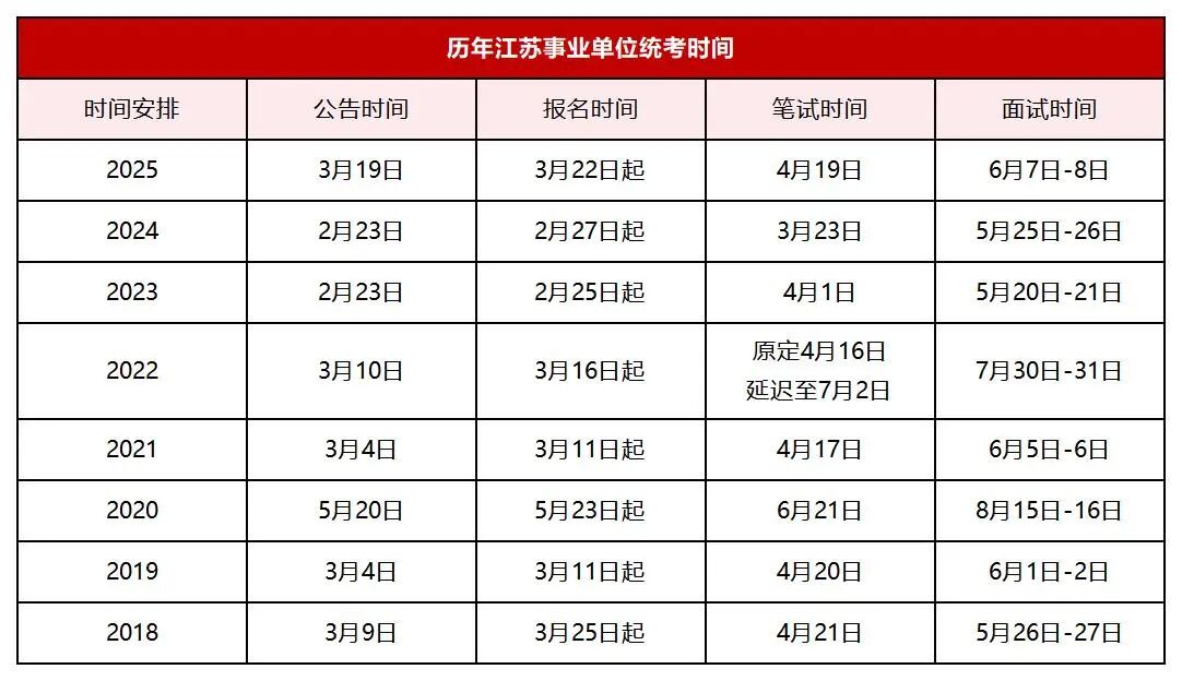 江苏统考近年一年只举办一次,一般在3月份发布公告,4月份进行笔试。由全省 组织考试,考试试卷和考试时间均比较 ,我们先了解一下往年统考的公告发布时间: