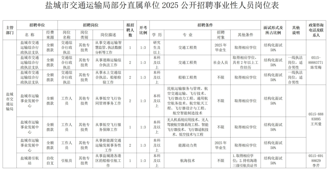 为进一步加强交通人才队伍建设,更好地选拔 适岗人才,优化人员结构,盐城市交通运输局所属盐城市交通运输综合行政执法支队、盐城市运输事业发展中心、盐城港引航站面向社会公开招聘11名事业性质工作人员,有关事项公告如下:
