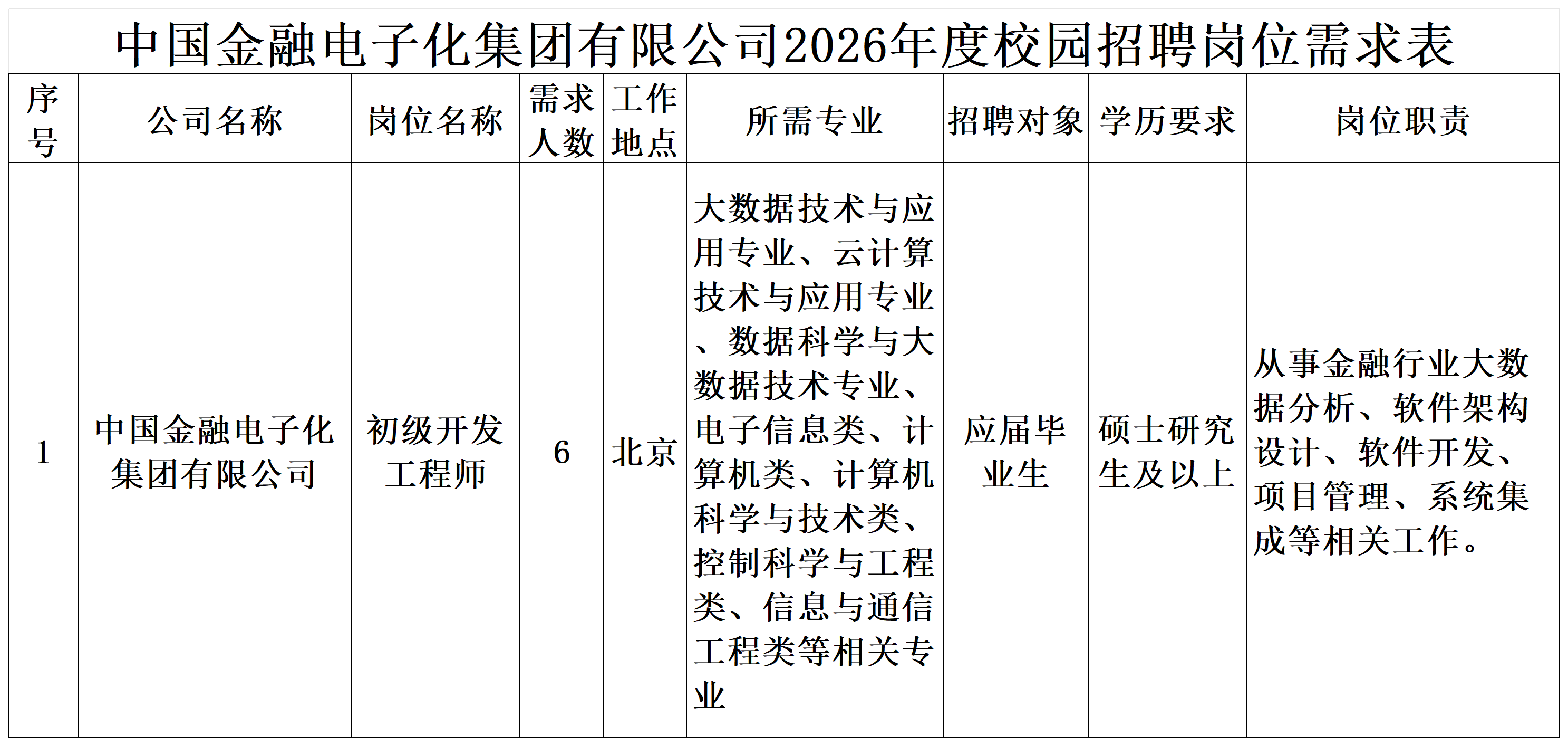 - 6人!中国金融电子化集团有限公司2026年度校园招聘